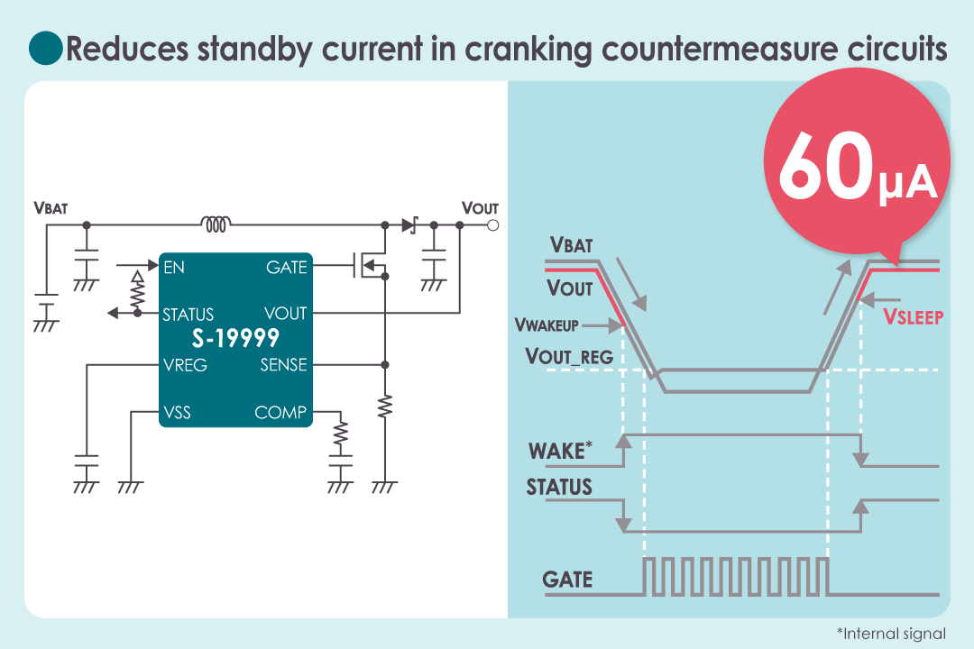 A feedback resistor is also integrated into the S-19999 Series. In sleep mode, the current consumption is reduced to 60µA by blocking the current of the feedback resistor, thus contributing to reduced standby current in cranking countermeasure circuits.