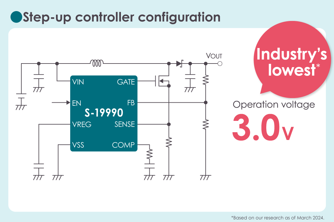 The S-19990 Series is the industry’s lowest* operation voltage of 3.0V for a 36V operation step-up switching regulator controller.