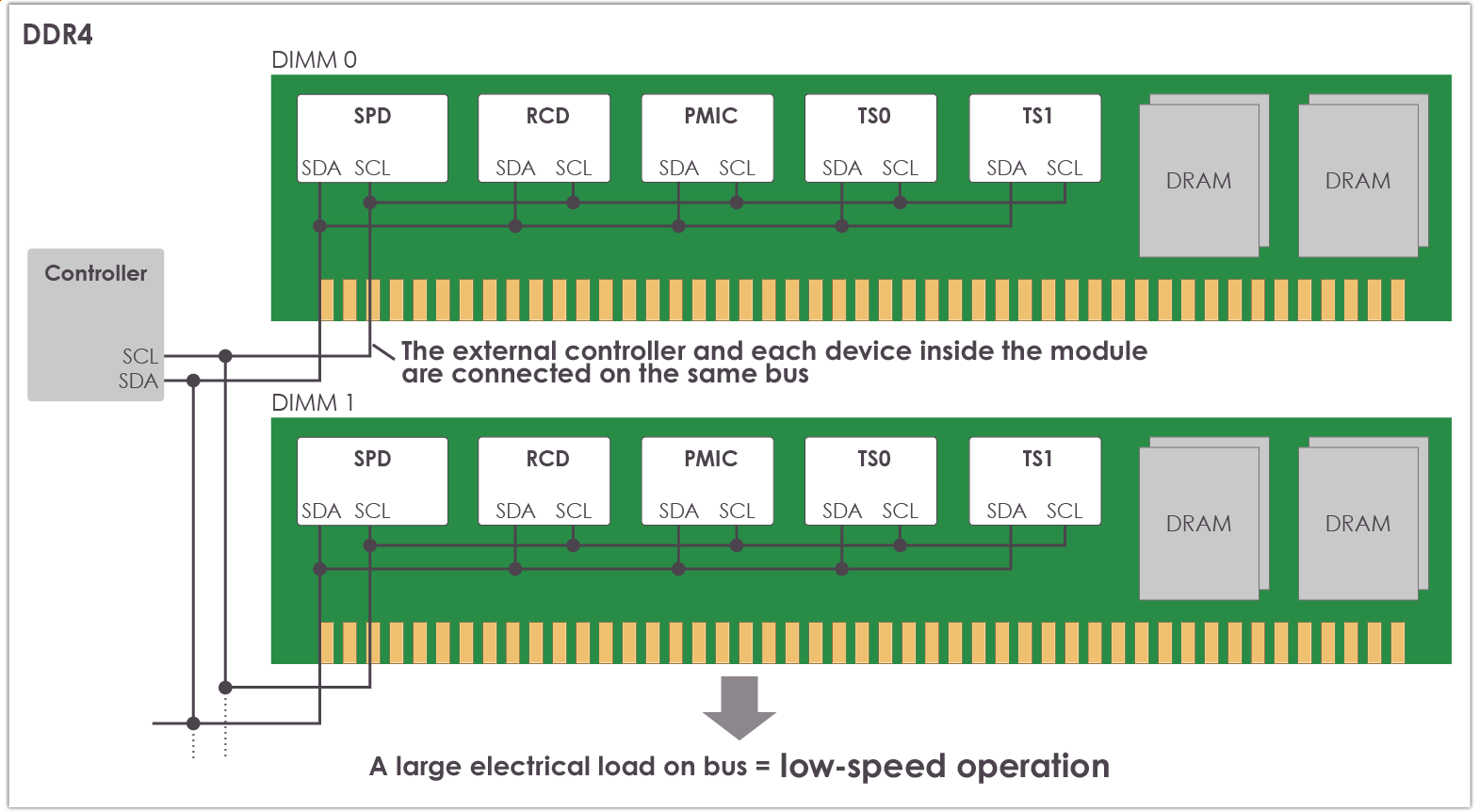 Therefore, if each device in the module is directly connected to the external controller as in DDR4, there is a problem of increased electrical load on the bus. To address this issue, within the DDR5, the external controller and each device on the DIMM board are connected via SPDs.