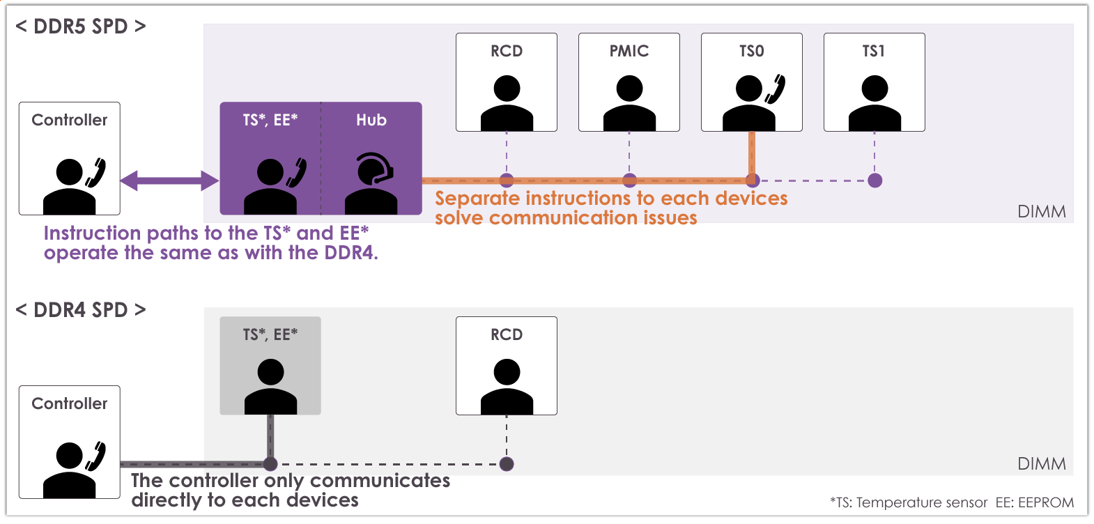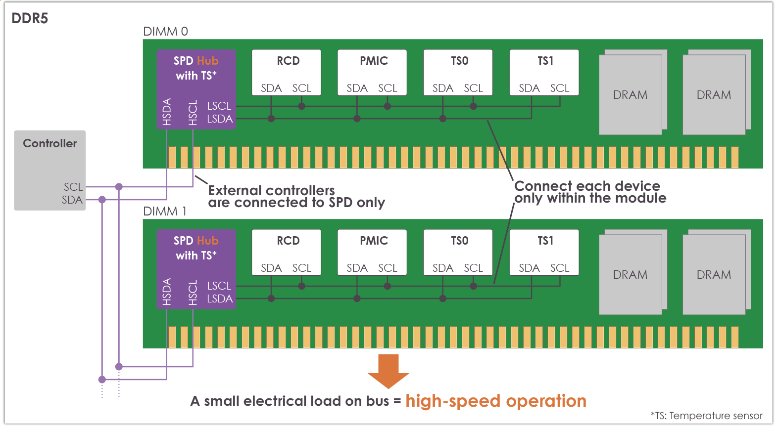The Hub function has been added to SPD to properly manage instructions from the external controller to the device on the DIMM board, while the function of the SPD memory /temperature sensor is operated in the same way as with DDR4. The Hub function solves the communication issues that can arise with bus separation.