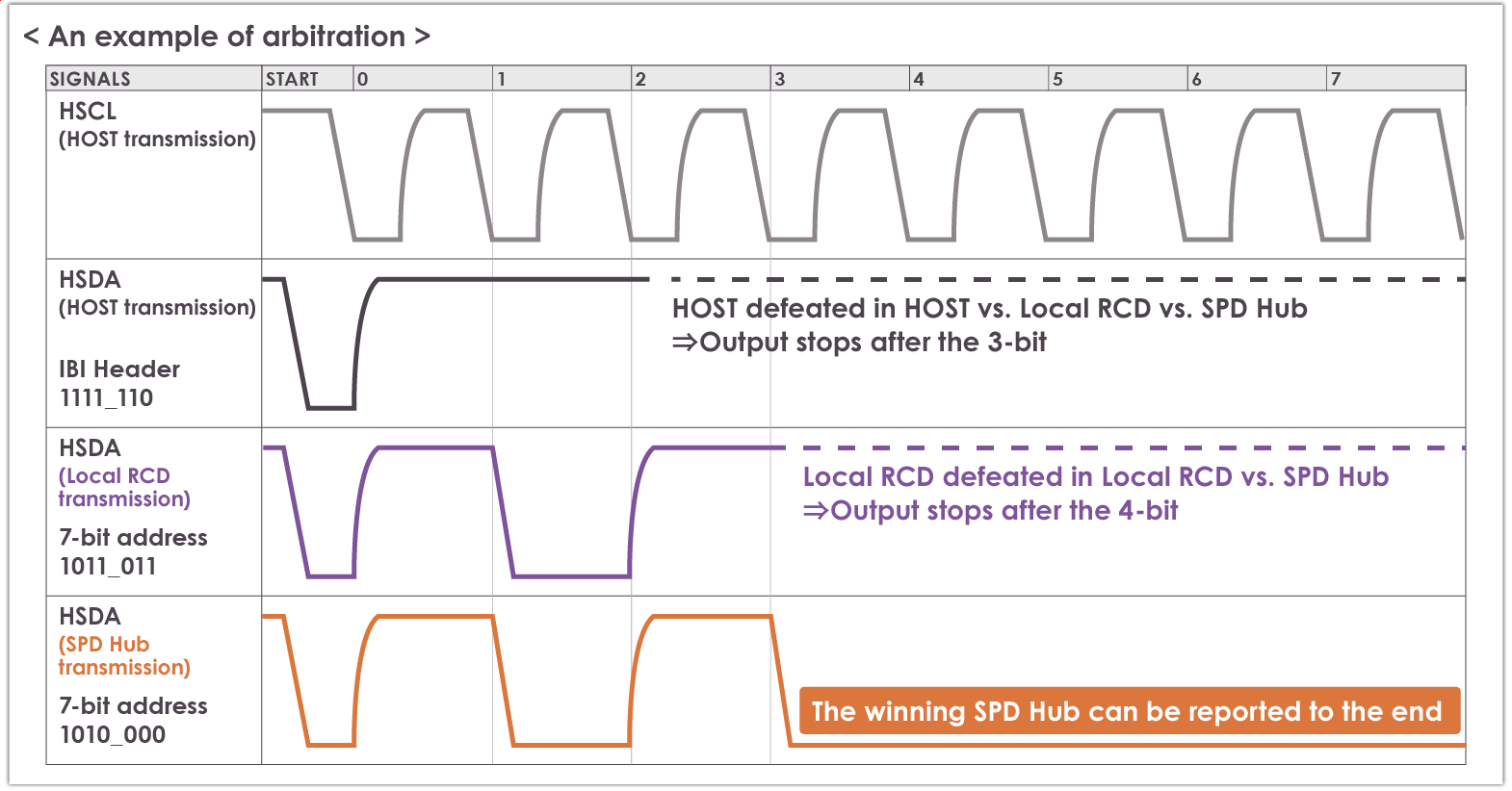 The data line outputs are compared for each bit, and if there are multiple outputs, the “L” output has priority, and the device with an “H” output stops outputting itself. This arbitration process determines which device has the highest priority.