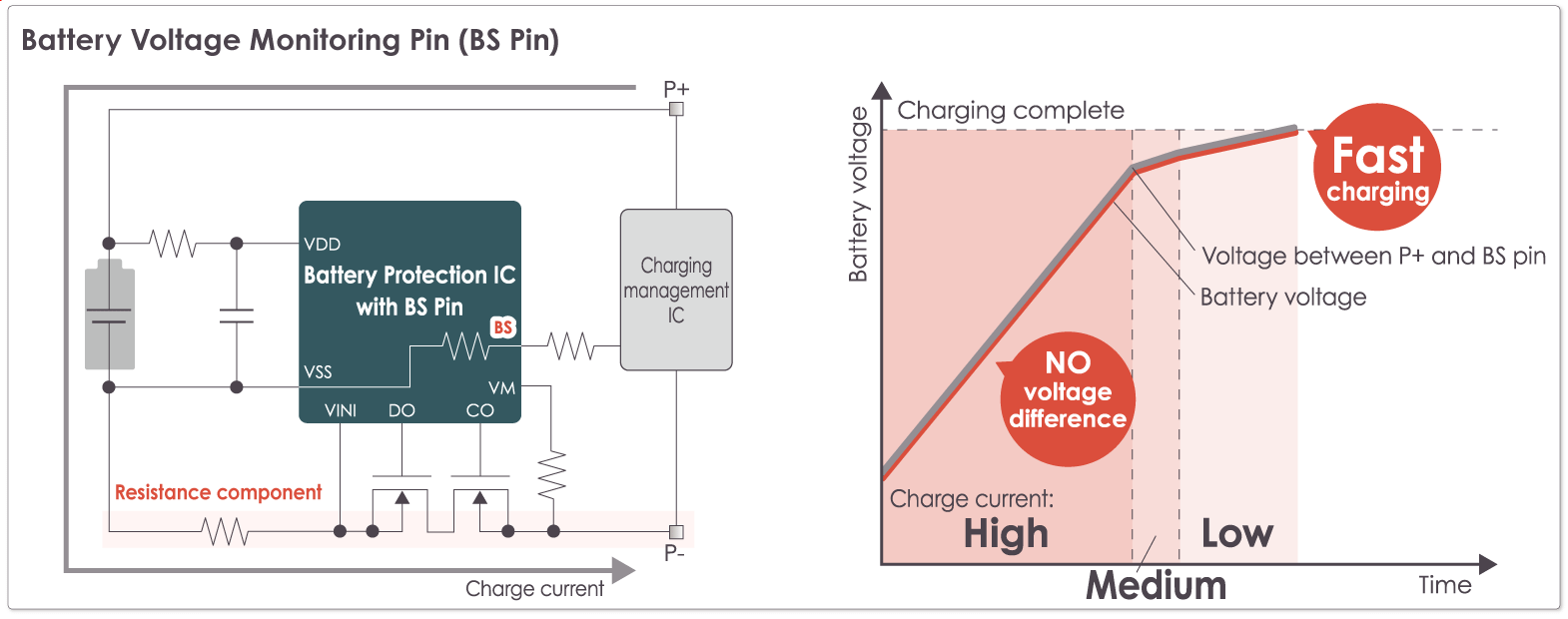 A charging management IC can control charging by monitoring the voltage between the P+ and BS pin. Optimal charging control can be achieved because the IC can monitor a voltage almost identical to that of the battery, resulting in reduced charging time.