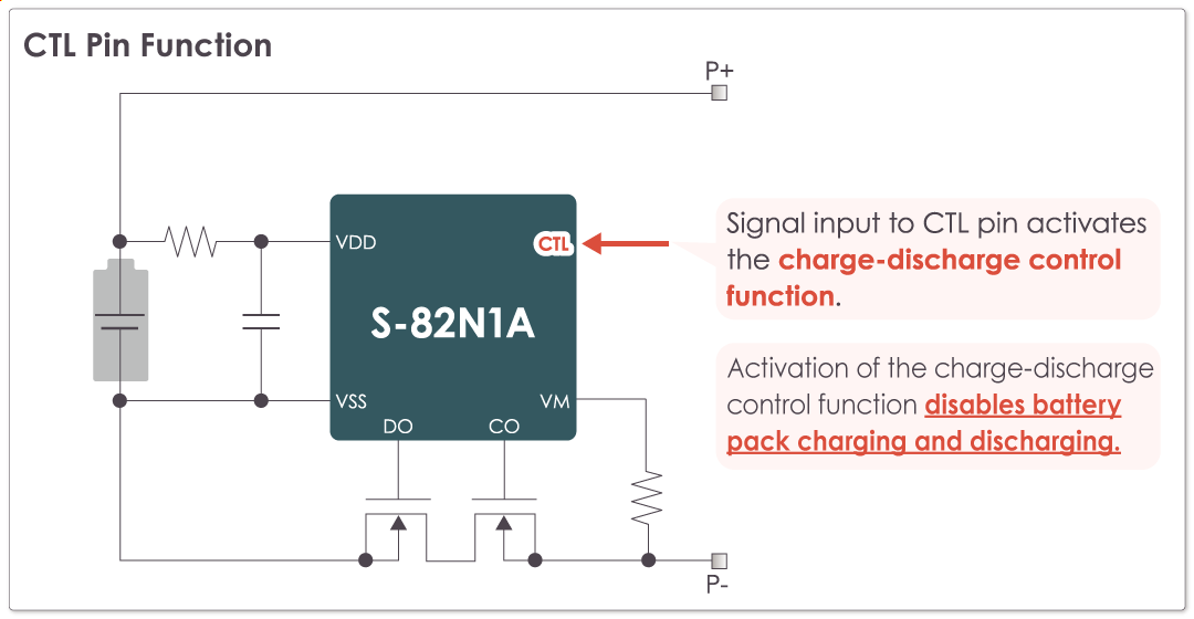 An external input to the CTL (charge-discharge control signal input) pin activates the charge-discharge control function and disables battery charge and discharge.
