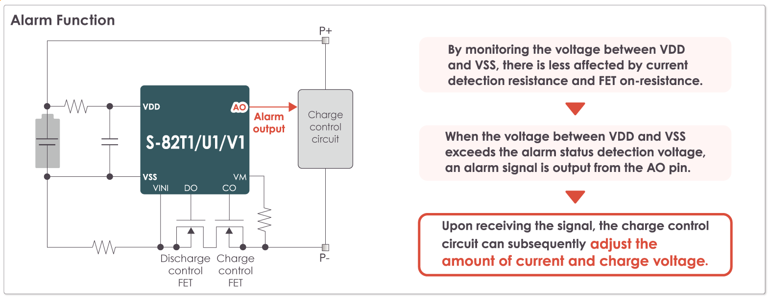 This function accurately detects the battery voltage even during fast charging and outputs an alarm signal.