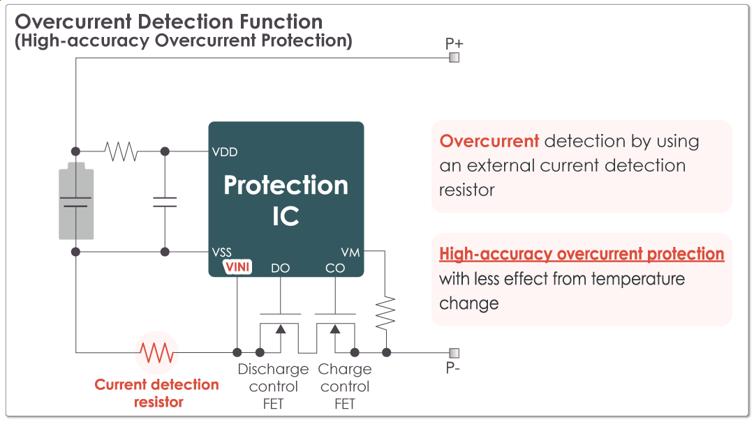 By using an external current detection resistor to deliver high-accuracy overcurrent protection, battery voltage and temperature fluctuations are unlikely to occur.