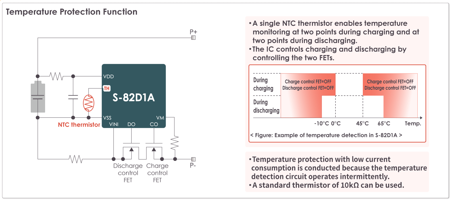 An external NTC thermistor can be used to monitor the temperature and control charging and discharging.
