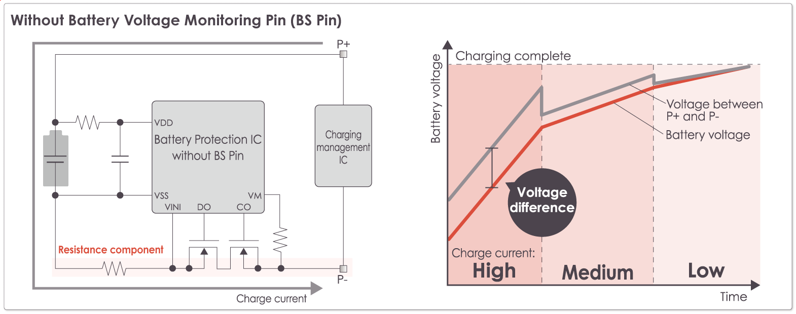 The charging management IC (charger) has no choice but to control charging by monitoring the voltage between P+ and P-. Since there are resistance components between VSS and P-, such as the current detection resistors or charge and discharge control FETs, there will always be a voltage difference between VSS and P- depending on the charge current. This voltage difference makes optimal charging control difficult and increases charging time.