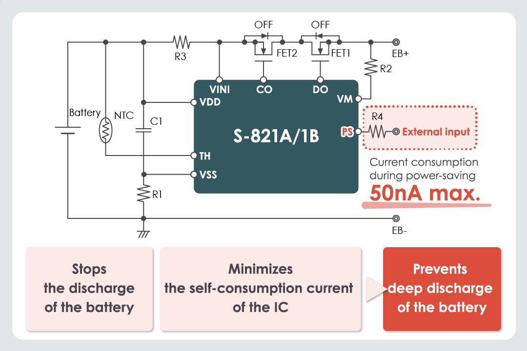The S-821A/1B Series is equipped with a power-saving input pin (PS pin), which can activate a power-saving function with an external signal, enabling it to stop the discharge of the battery.