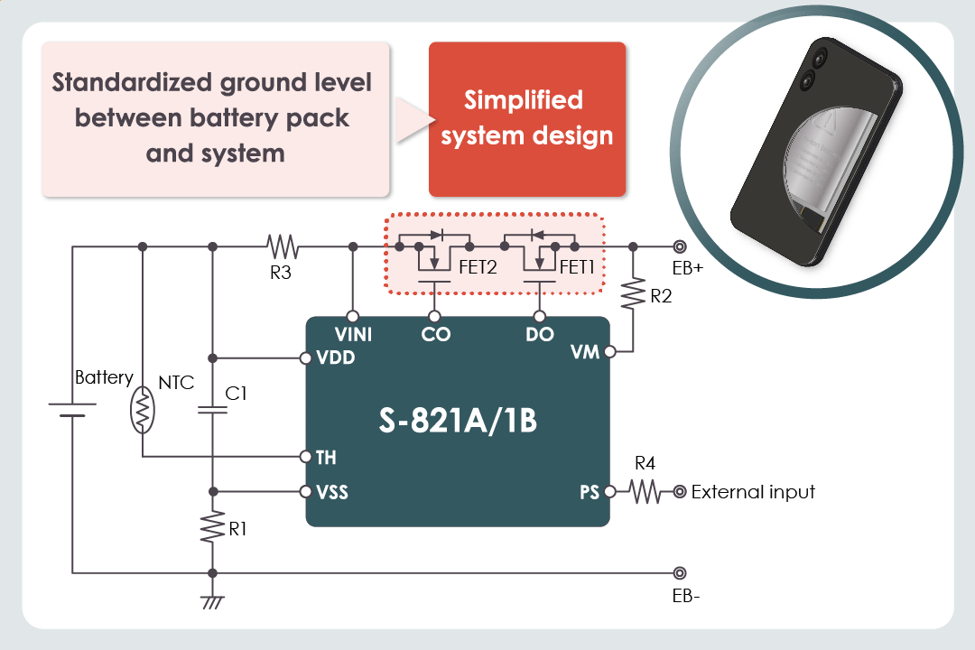 The S-821A/1B Series is an IC that can provide Nch high-side protection, which is necessary for short-circuit protection in metal-cased batteries.