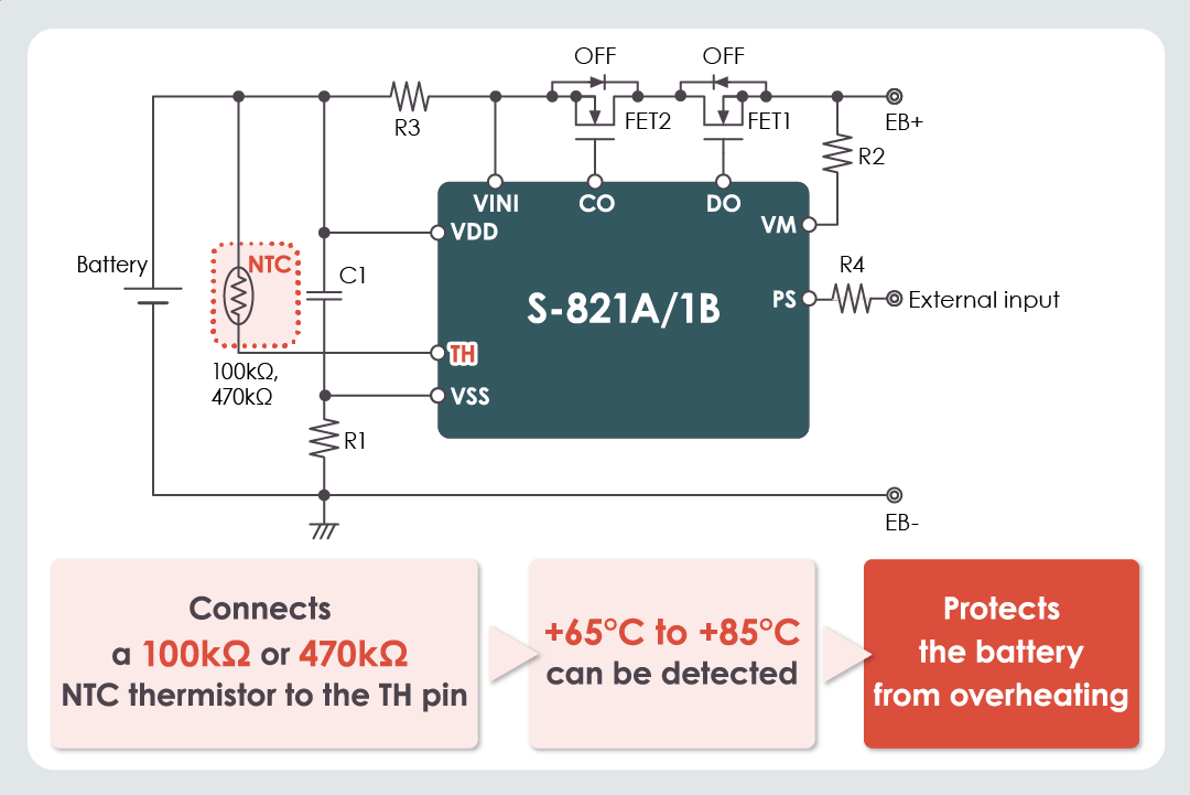 Overheating protection can be achieved by connecting an NTC thermistor to the S-821A/1B Series. By using an NTC thermistor with a resistance of 100kΩ or 470kΩ, temperatures from +65°C to +85°C can be detected. This improves battery safety and prevents malfunctions and problems caused by overheating.