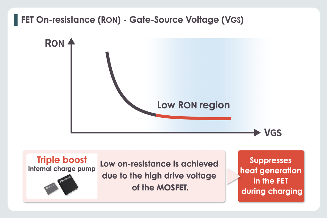 This reduces the on-resistance, suppressing the heat generated by the MOSFET and improving safety during charging.