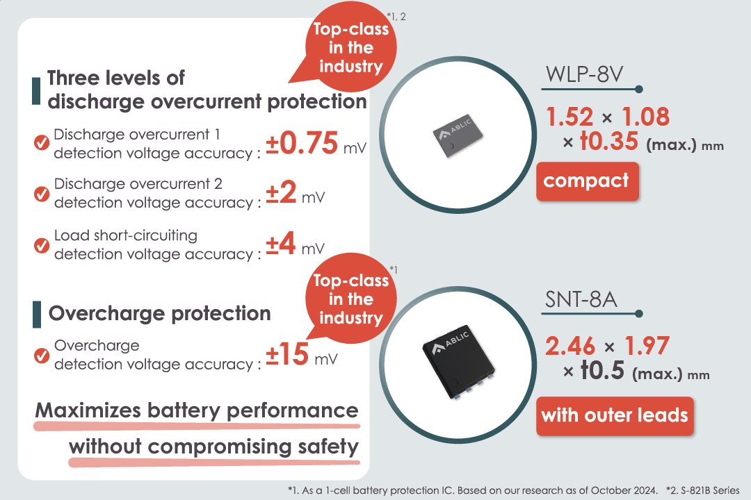 The S-821A/1B Series has three levels of discharge overcurrent protection, and the accuracy of each level is considered top-class in the industry*1, *2. Furthermore, the overcharge detection voltage accuracy of ±15mV is also recognized as top-class within the industry*1.