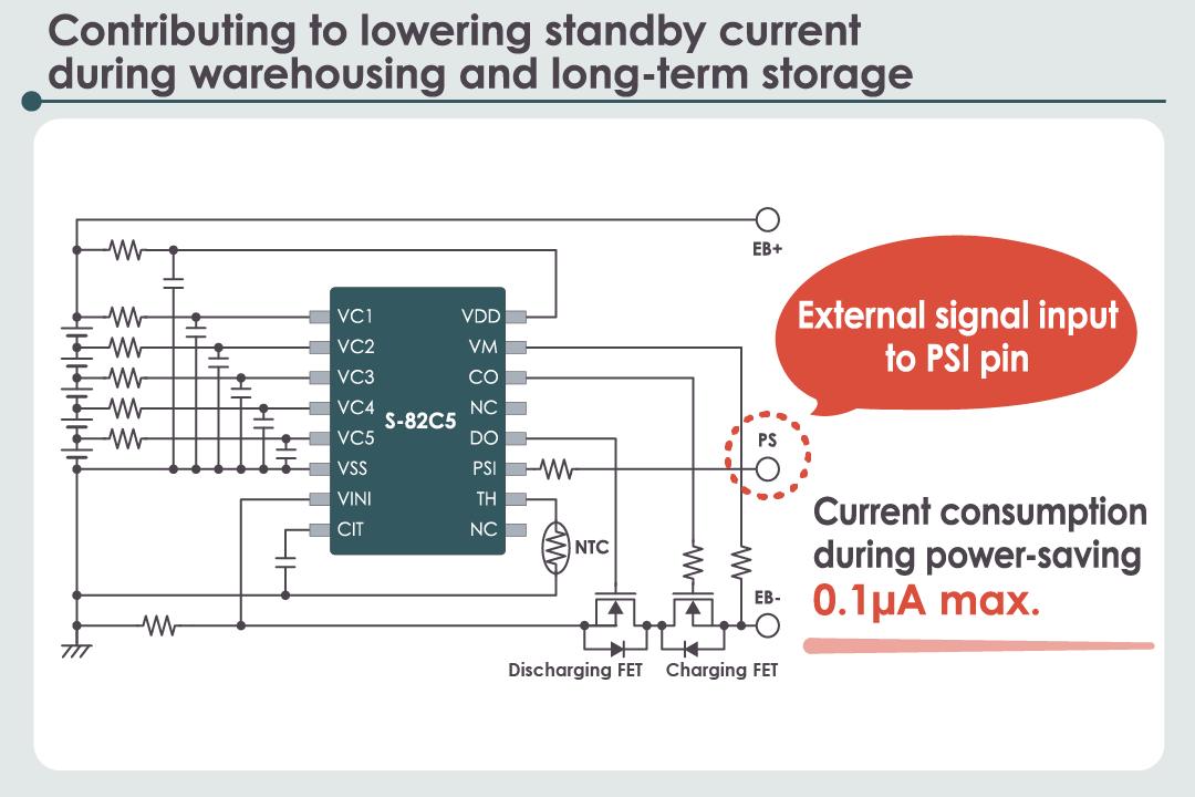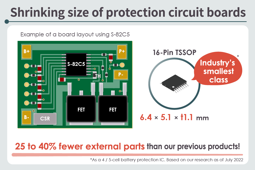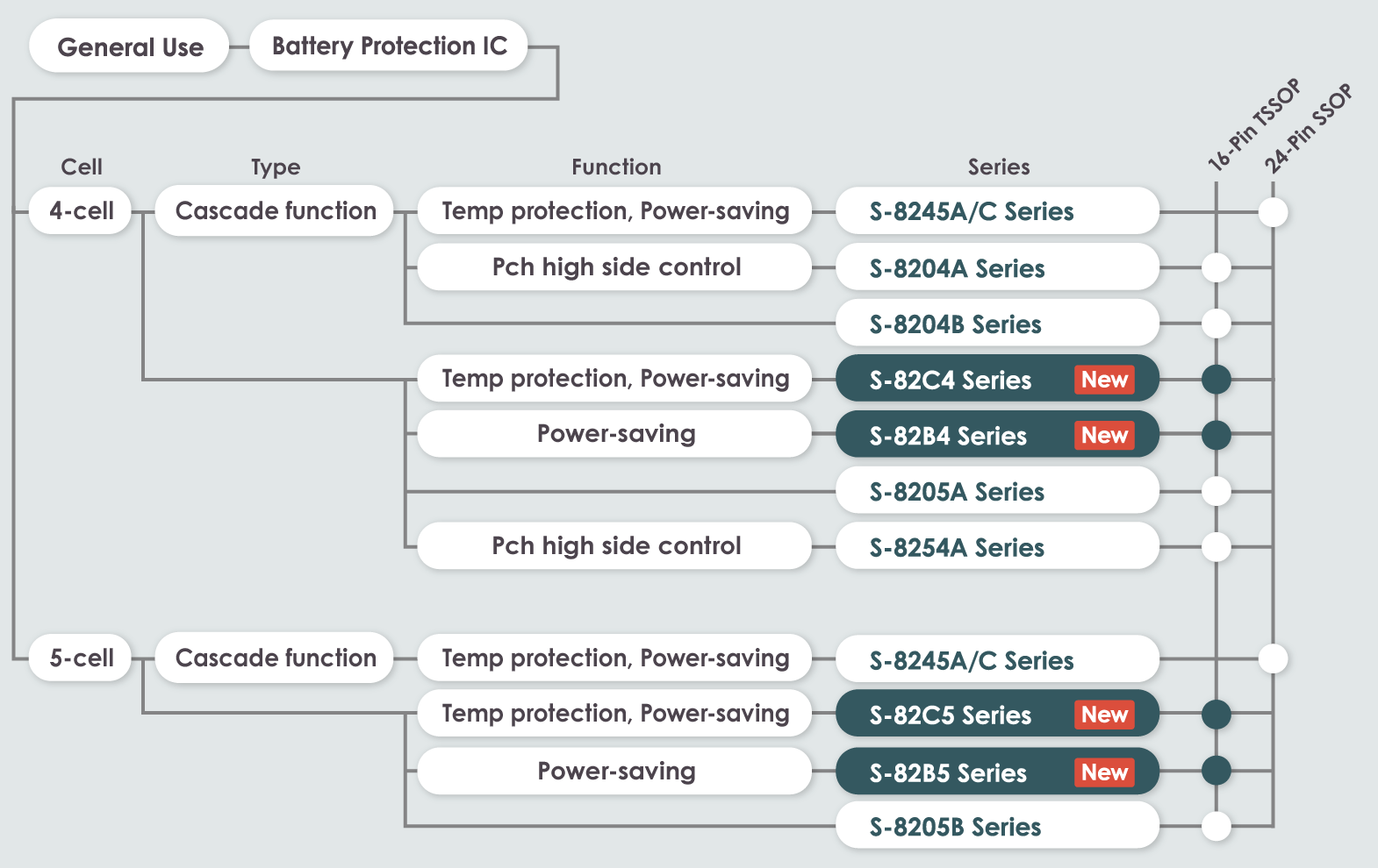 The S-82B4/5 and 82C4/5 Series have been tailored to the protection of 4-cell and 5-cell battery packs and have 25 to 40% fewer external parts than our previous products.