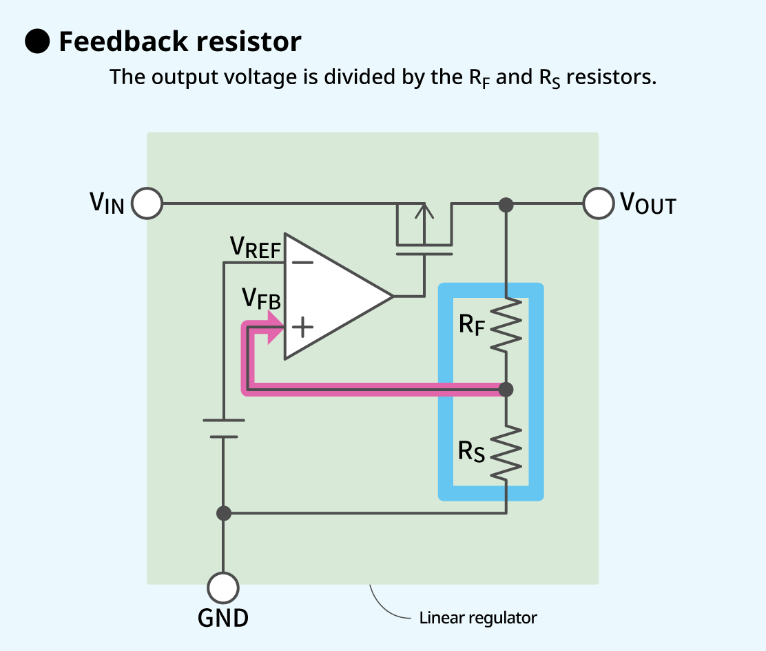 A feedback resistor is connected between the output pin and ground (GND) to divide the output voltage (VOUT) by the RF and RS resistors to output the resulting voltage (VFB) to an error amplifier.