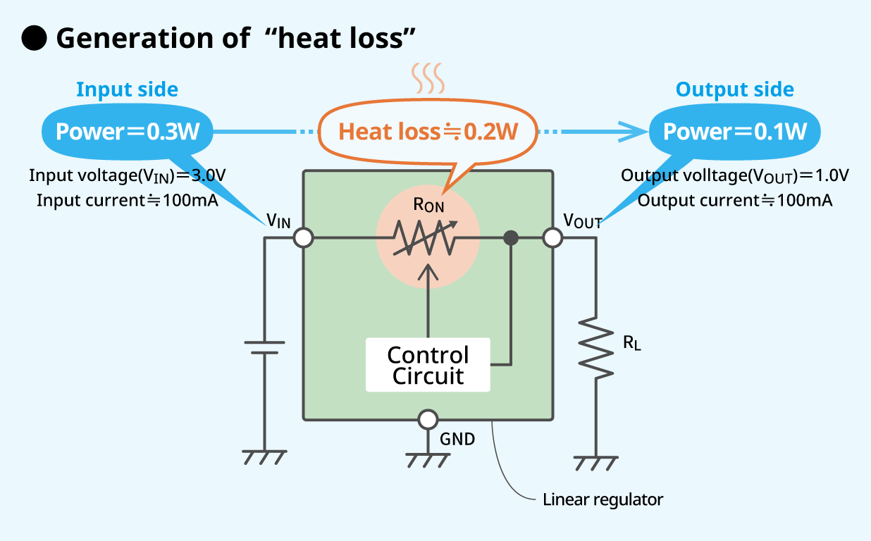 “Heat loss” in the linear regulator is what accounts for this difference, most of which is self-heating through control elements, and the remainder is consumed by the self-current consumption of the linear regulator. The larger the difference between input and output voltage and the greater the load current, the larger the heat loss will be.