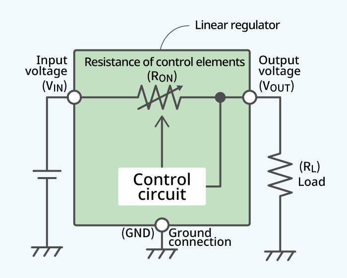 A linear regulator can maintain a steady output voltage (VOUT) by adjusting the resistance of control elements (RON) to compensate for input voltage (VIN) and load (RL) changes. Details of internal configuration and control are explained in “2. Internal configuration of a linear regulator.”