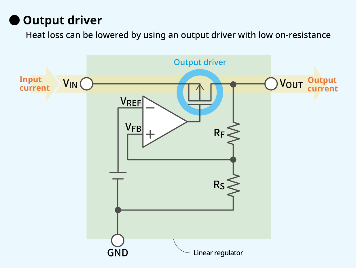 Using an excellent output driver, that is, an output driver with low on-resistance, it will be possible even for a regulator with high output current to deliver the required output voltage from a low input voltage while also lowering heat loss.