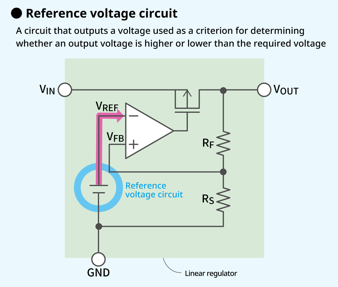A reference voltage circuit outputs a voltage (= reference voltage, VREF) used as a standard to the error amplifier to determine whether an output voltage (VOUT) is higher or lower than the required voltage.