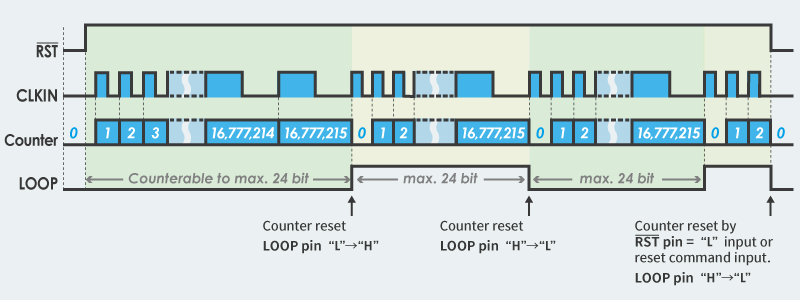 Whenever the counter reaches 16,777,215, the LOOP (counter loop flag output) pin toggles the output (Low --> High --> Low -->...).  This allows the user to confirm the output state of the Loop pin using the microcontroller or other means and use the system to add to the counter value to count beyond 16,777,215.detail of counter IC operation
