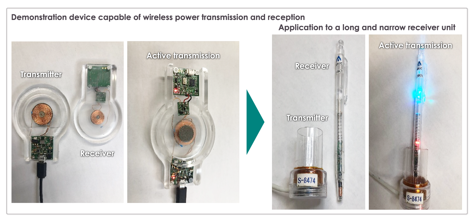 The first step is to select coils that meet these values, and then consider a structure that can induce electromagnetic induction. It may be challenging to use a flat coil due to its shape when charging a long and narrow receiver unit, but in the demonstration device, electromagnetic induction is made possible by winding the coil in a spiral shape, achieving wireless power transfer.