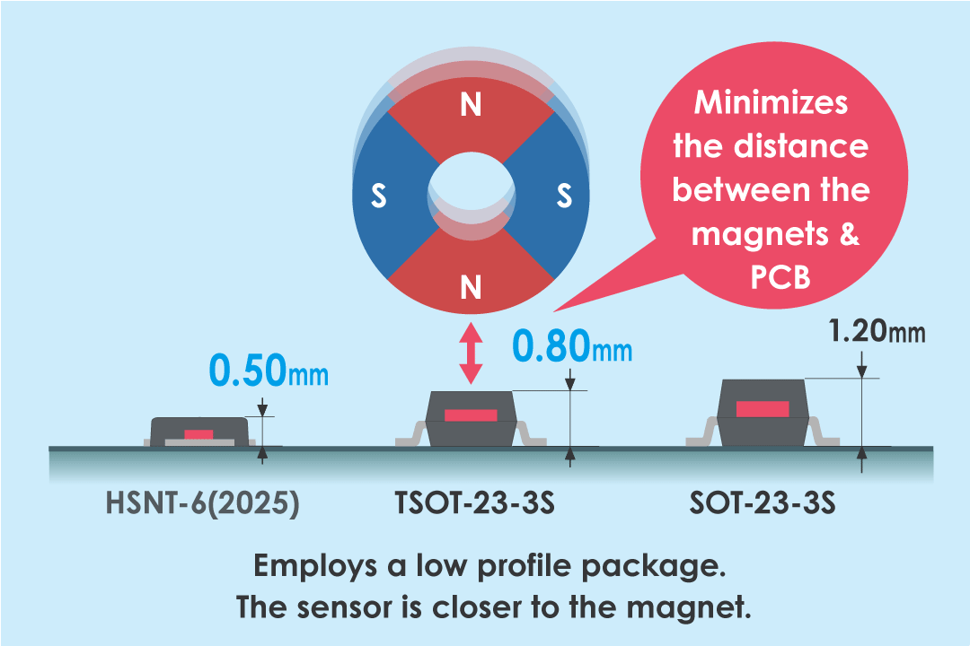 This new package is the TSOT-23-3S (2.9 x 2.8 x t0.8mm), the world’s lowest profile package, which shrinks the distance between the magnet and the PCB to the footprint of the world standard SOT-23-3 (2.9 x 2.8 x t1.3mm) package.