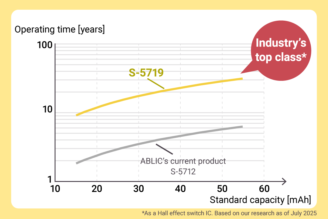 This translates to about five times longer operating time compared to our current S-5712 Series products, significantly extending battery life of battery-powered applications.