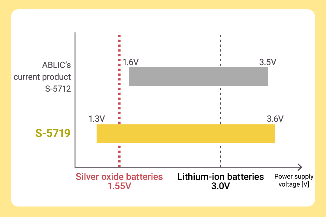 The S-5719 Series features a wide power supply voltage range from 1.3V to 3.6V. This makes it well-suited for electronic devices powered by typical lithium-ion batteries (approx. 3.0V), as well as those operating at lower voltages, such as silver oxide batteries (approx. 1.55V).