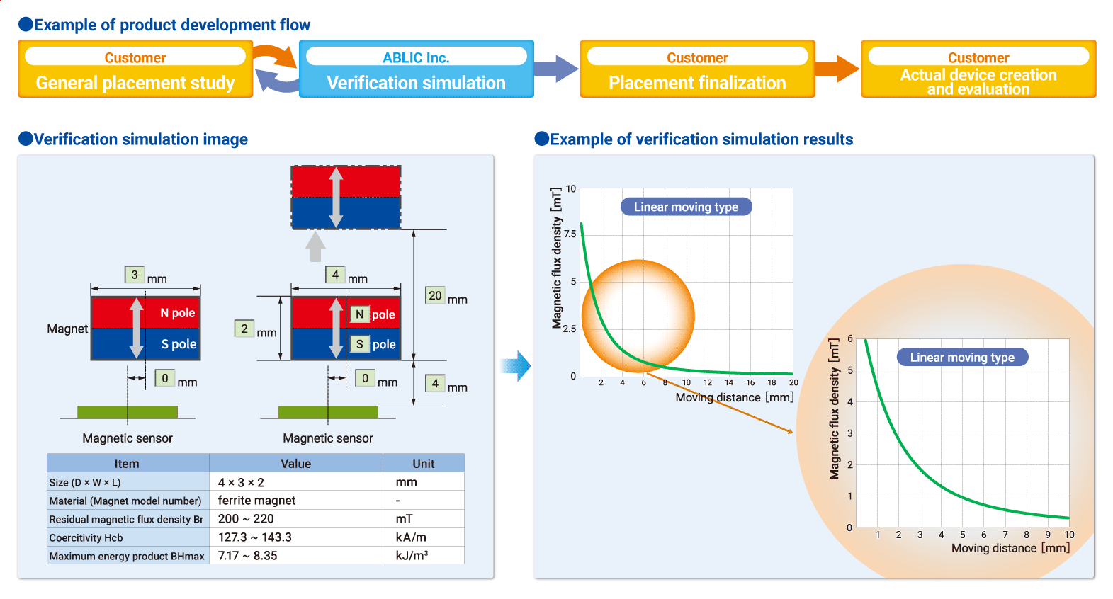 ABLIC offers a “magnetic simulation service” to help customers find the ideal combination between magnets and our magnetic sensor ICs for their systems. Our magnetic simulation service will reduce prototype production, development time, and development costs. Additionally, it will contribute to the optimization of parts to realize high-cost performance.