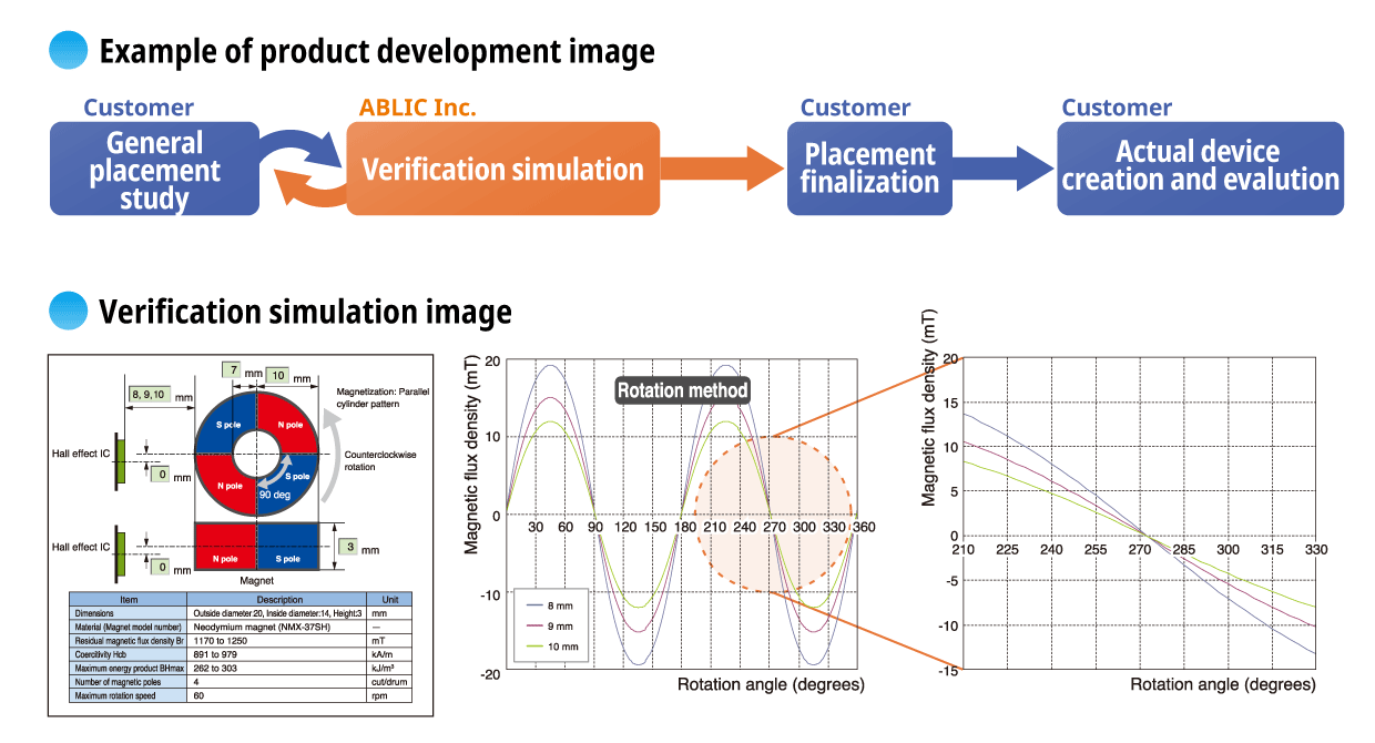 ABLIC Inc. offers a "magnetic simulation service" that provides the ideal combination of magnets and our Hall effect ICs for customer systems. Our magnetic simulation service will reduce prototype production, development period and development costs. In addition, it will contribute to optimization of parts to realize high cost performance.