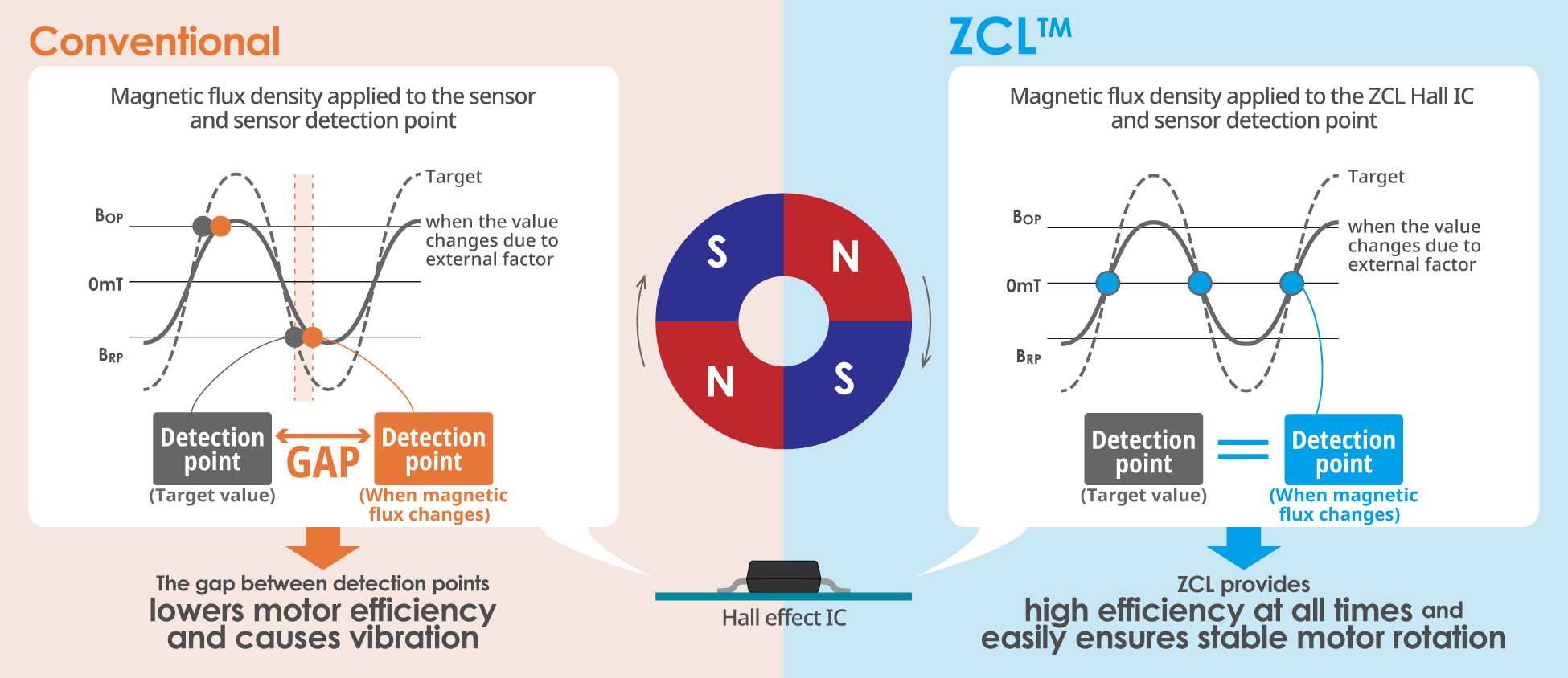 Unlike conventional Hall effect ICs, a ZCL Hall effect IC senses when polarity changes and is capable of optimal timing output even if magnet characteristics change as temperature rises. This prevents the successive reduction of efficiency that occurs when a Hall effect IC misses the optimal timing for output.