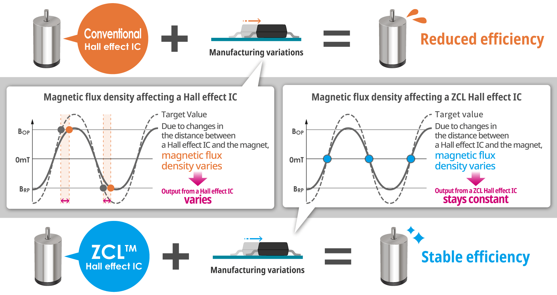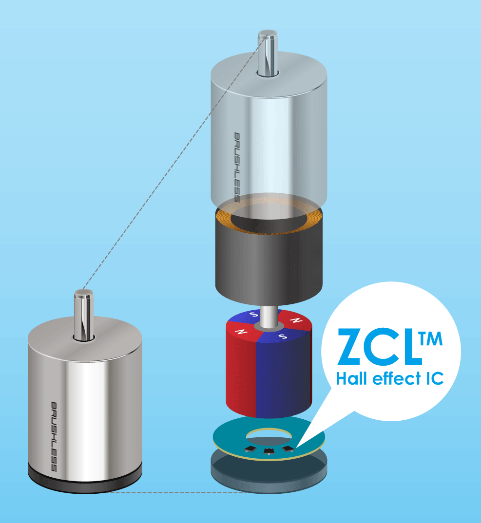A ZCL Hall effect IC, on the other hand, senses when polarity changes and outputs a signal at the right time regardless of variations in the distance between the magnet and the sensor and prevents reductions in efficiency due to any manufacturing variations.