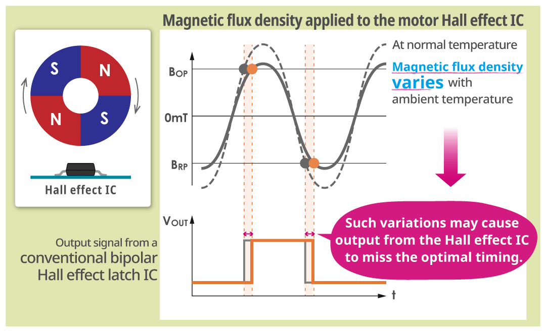 In a Hall effect IC using the conventional method of detection, the change in the magnetic flux density caused by the temperature rise in the magnet means that the signal misses the optimal timing for output leading to a vicious circle of lowered motor efficiency and further rises in temperature.
