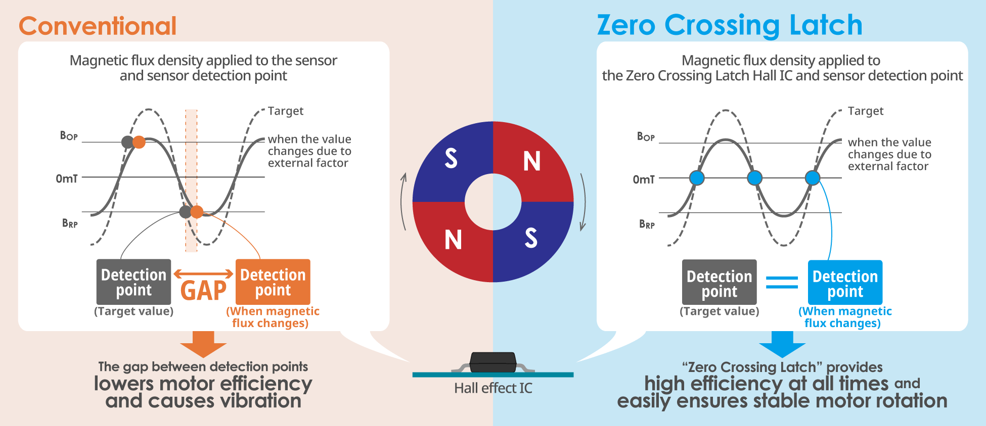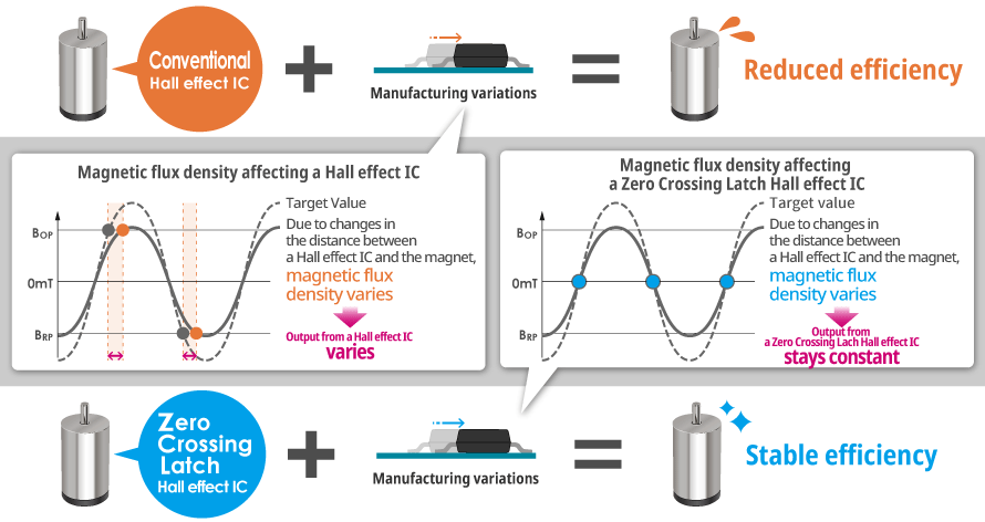 A Zero Crossing Latch Hall effect IC, on the other hand, senses when polarity changes and outputs a signal at the right time regardless of variations in the distance between the magnet and the sensor and prevents reductions in efficiency due to any manufacturing variations.