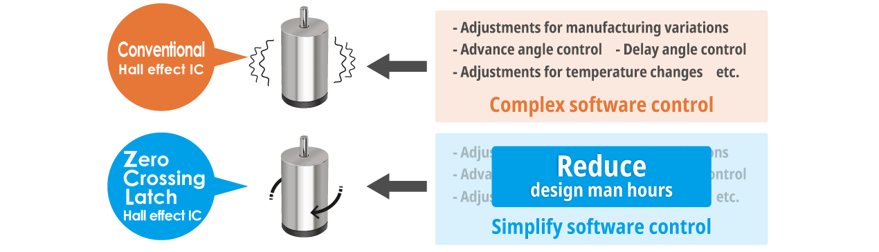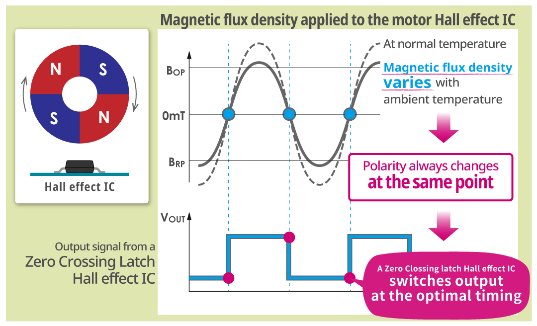 Zero Crossing Latch Hall effect ICs can easily prevent drops in motor efficiency resulting from temperature variations and manufacturing variations.