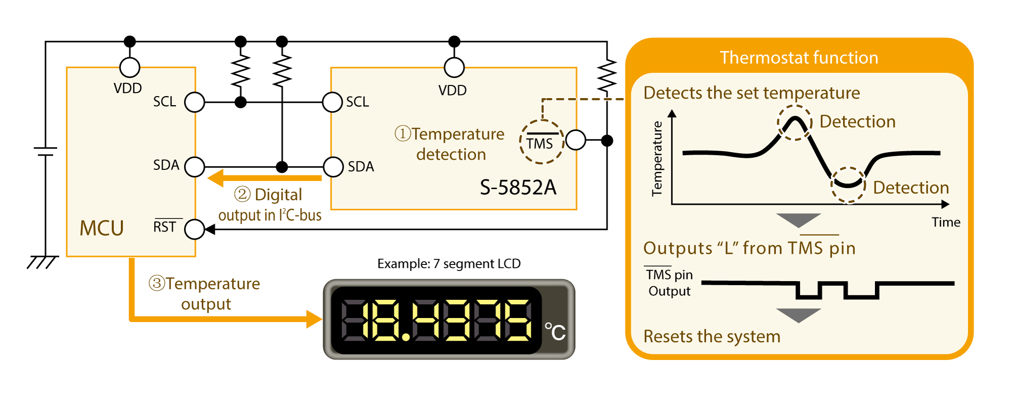 The temperature data detected in S-5852A can be digitally output to the MCU in high resolution 0.0625°C. Moreover, system resetting at a set temperature is also possible due to the thermostat function.