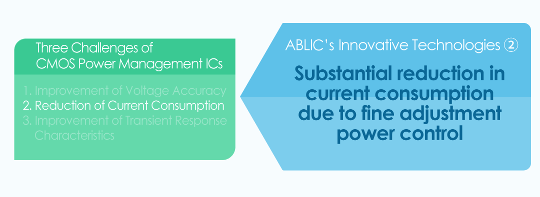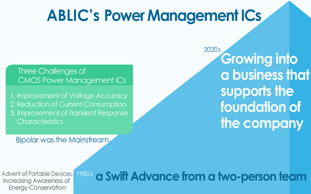 In the 1980s, bipolar ICs played a leading role in power management ICs. CMOS power management ICs have problems such as large characteristic fluctuations due to manufacturing variability, small output current, and poor transient response. However, the development of battery-powered portable devices such as the Walkman moved ahead, and awareness of energy conservation was also growing. Fortunately, advances in semiconductor technologies have created a lot of applications that do not require much output current, while demand for power management ICs with lower current consumption has become stronger. As an ABLIC (At that time, Seiko Instruments & Electronics Ltd.) having a low-voltage, low-current consumption CMOS IC for watches in its DNA, there were strong demands for the CMOS power management ICs that consume less power than bipolar circuits. In 1987, however, the power management IC team consisted of my boss who had been transferred from the clock division and me. The challenge started with 2 people in total. Today, ABLIC's power management ICs are a mainstay business, accounting for more than half of our sales. The reason for this growth was the existence of three innovative technologies.