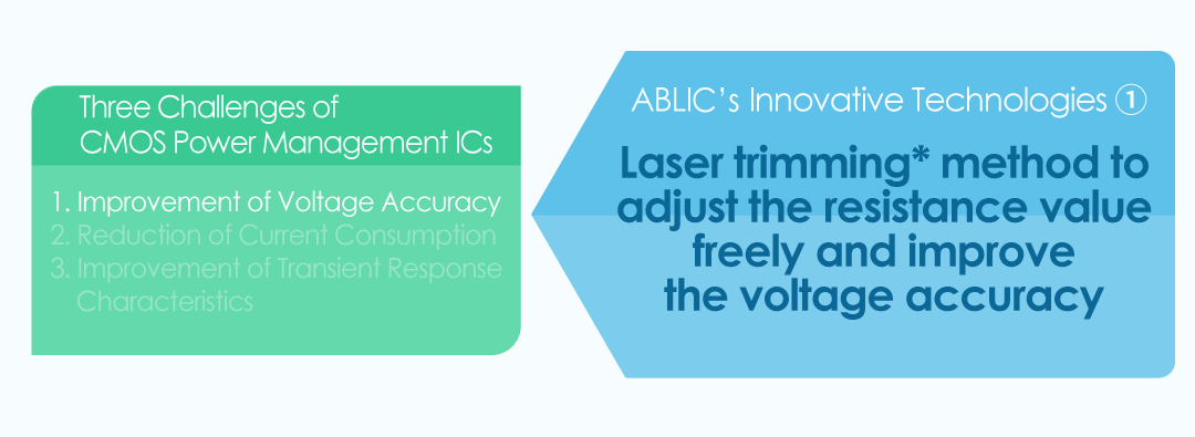 CMOS ICs have a problem that it is difficult to increase the accuracy of the output voltage and the detection voltage of the power management ICs because of the large manufacturing variability (threshold voltage variability) compared with bipolar ICs. To solve this problem, ABLIC has introduced a laser trimming system. In addition, a laser trimming method was devised in which fuse elements capable of adjusting the resistance value of resistance elements are prepared on a semiconductor wafer and adjusted according to the characteristics of each chip. This makes it possible to increase the accuracy of the output voltage and detection voltage. Incidentally, using this laser trimming technology, it has become possible to produce multiple products on a single wafer. Even today, this technology is used to provide high-precision power management ICs with an output voltage and detection voltage accuracy of ±1.0% or less.