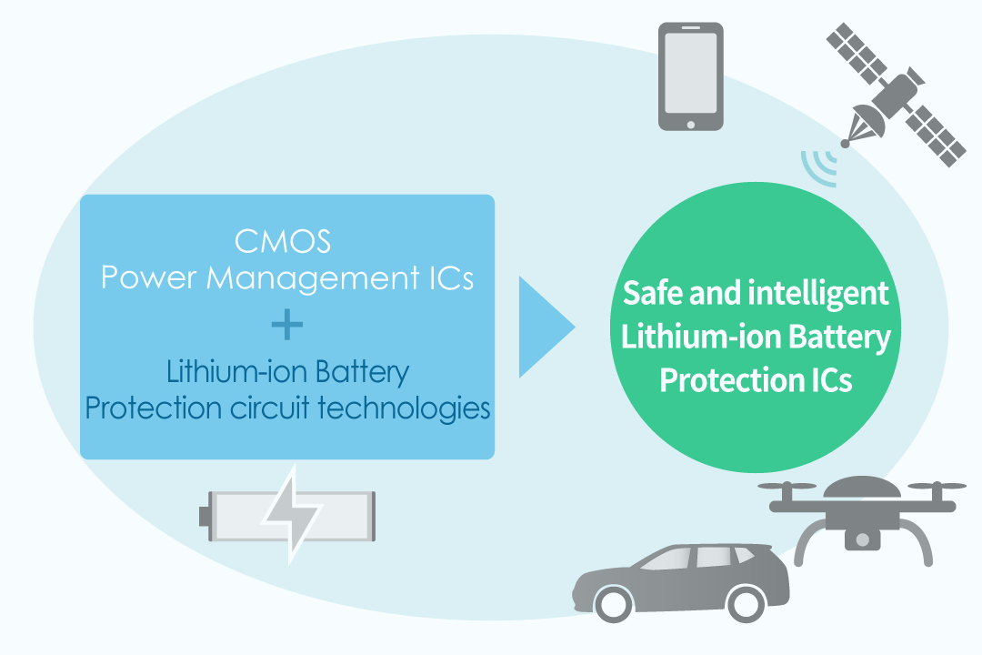In fact, ABLIC was the first company which developed lithium-ion battery protection ICs for commercial use. It is installed in the digital video camera made in Japan released in 1993. To use lithium-ion batteries safely, charge and discharge must be controlled properly, and ABLIC is succeeded developing the lithium-ion battery protection ICs for the first time in the world. Since then, lithium-ion batteries have been used in a variety of fields, including cellular phones, and they now account for one third of ABLIC's sales. We will continue to develop safer and more intelligent battery protection ICs.