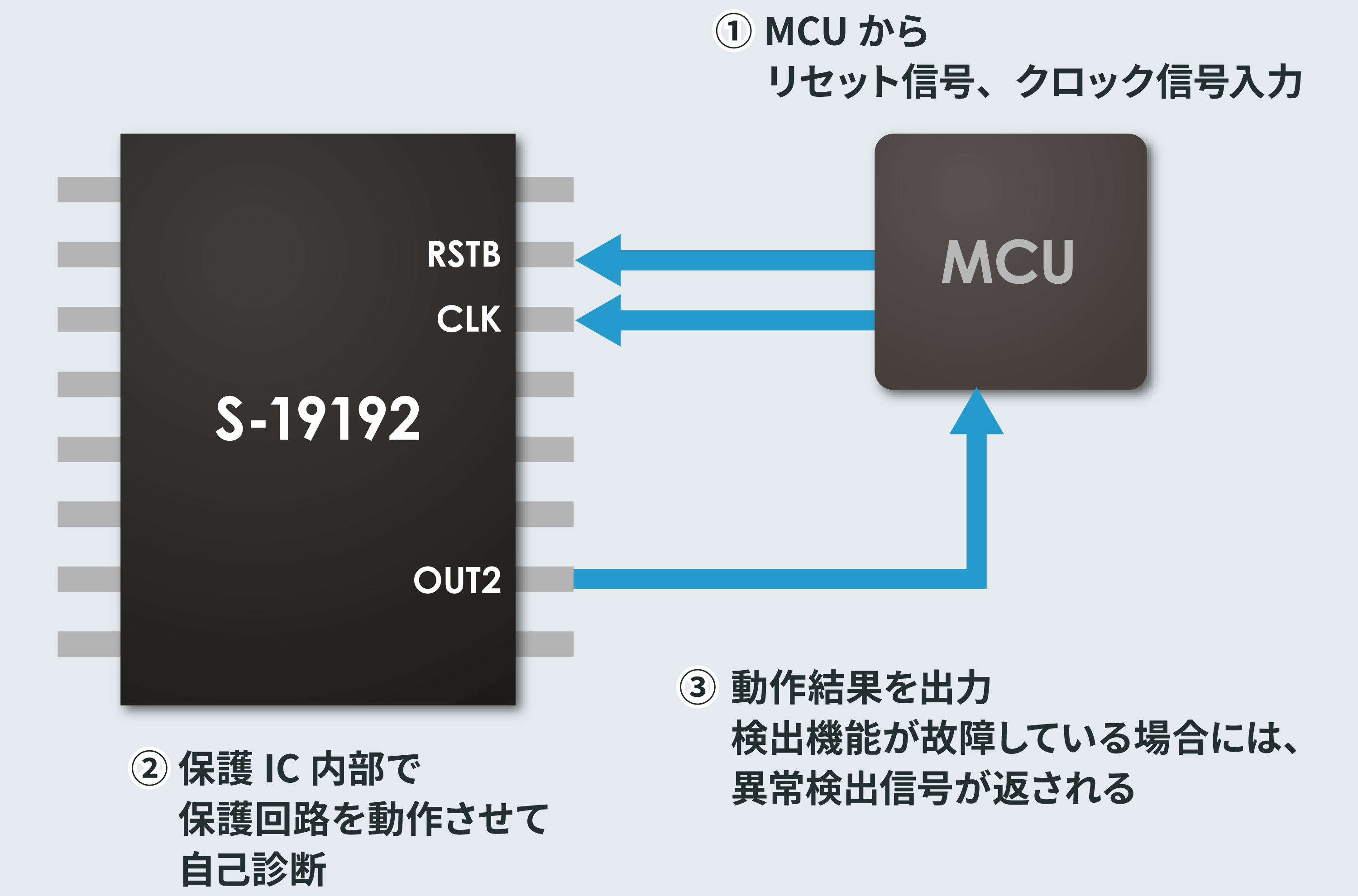 | リチウムイオン電池保護IC | S-19192 | 3~6セル直列バッテリー監視用IC。スタンドアロン監視が可能。自己診断機能を搭載。 |
