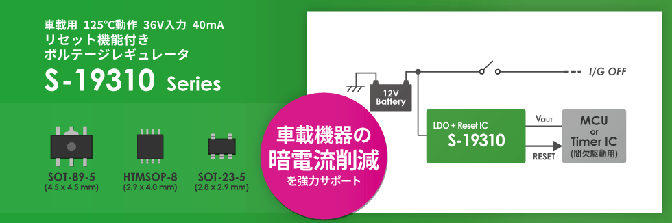 | LDOレギュレータ (リニアレギュレータ) | S-19310 | 間欠駆動時間を制御するタイマICへの電源供給・監視。業界最小の消費電流 2.2µA。リセット機能搭載。 |