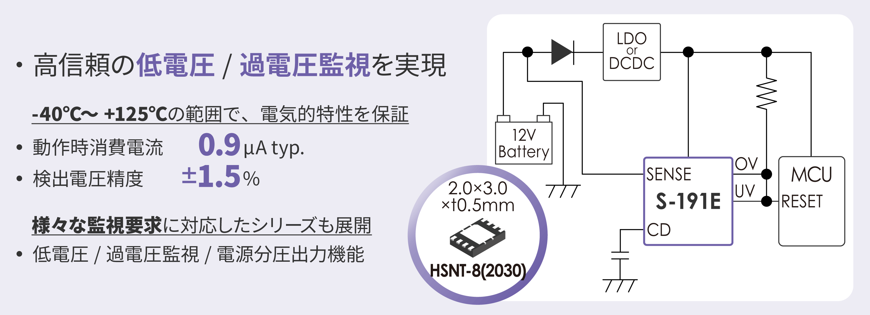 業界最速の電圧検出応答時間 10µs max.、動作時低消費電流 2.0µA typ.を実現。車載機器の安全性向上と低消費電流化に貢献します。