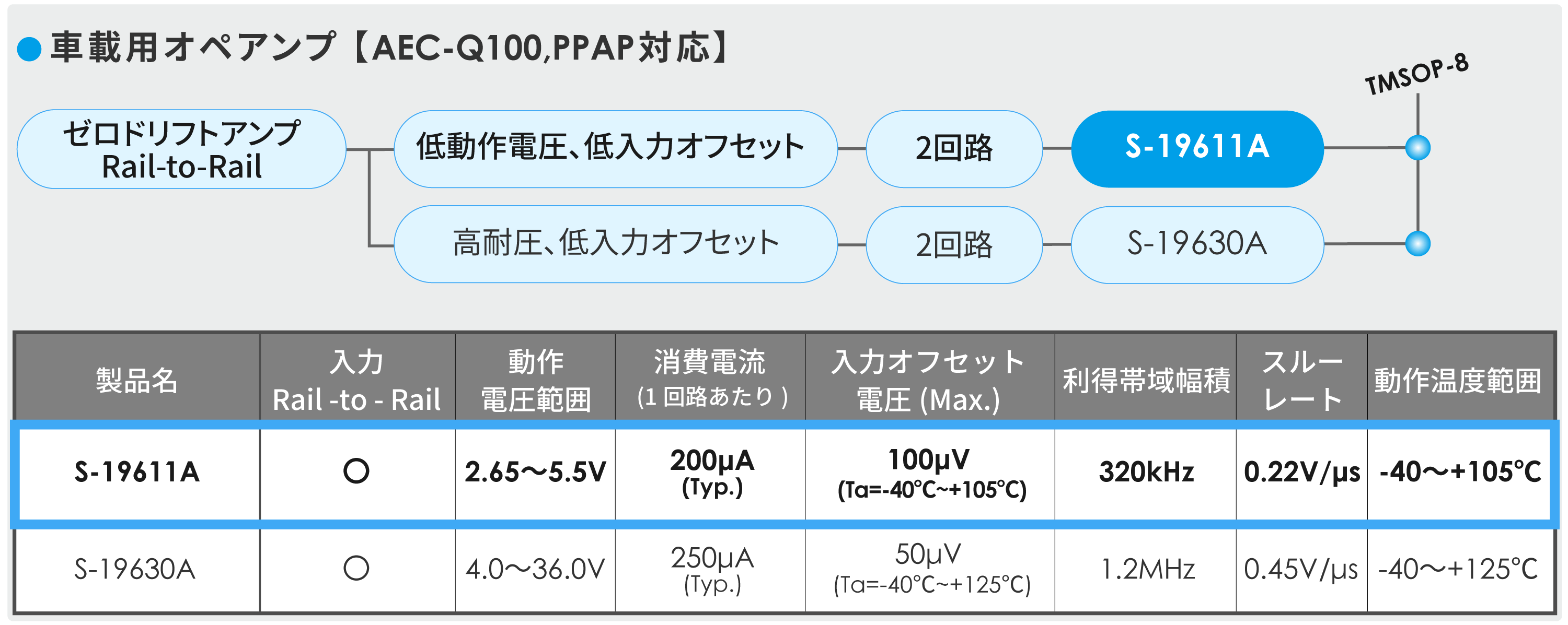 | オペアンプ | S-19611A | 高精度の電流検出が可能。5.5V動作。入力出力Rail-to-Rail。低オフセット電圧 100μV。 |