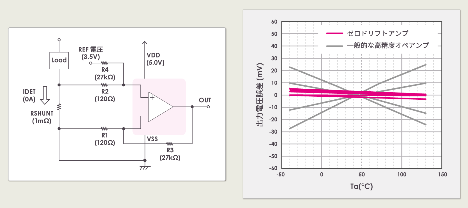 一方、ゼロドリフトアンプは入力オフセット電圧を自動補正しているため、温度変化により入力オフセット電圧が変化しても、入力オフセット電圧を常に限りなく最小に補正することができ、出力電圧誤差を小さく抑えることができます。