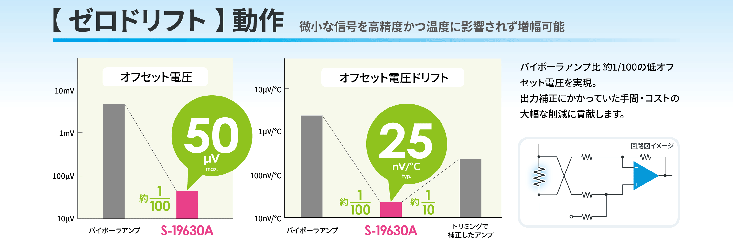 | オペアンプ | S-19630A | 高精度の電流検出が可能。36V動作。入力出力Rail-to-Rail。低オフセット電圧 50μV。 |