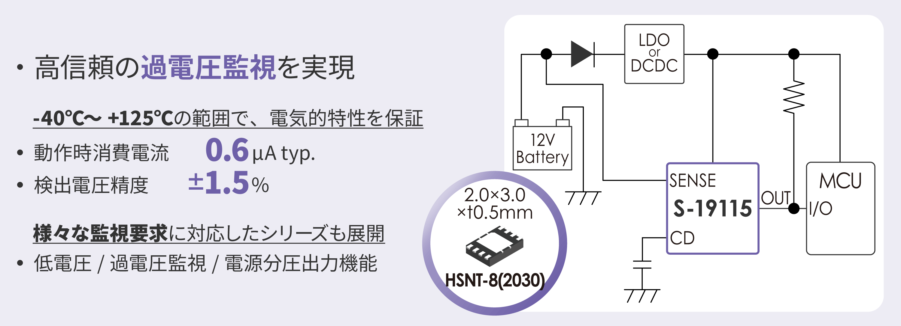 | バッテリーモニタリングIC (ボルテージディテクタ) | S-19116 | 高速検出応答 6.8μs max.。過電圧検出用。SENSE端子逆接続保護回路内蔵。消費電流 2.0μA。 |