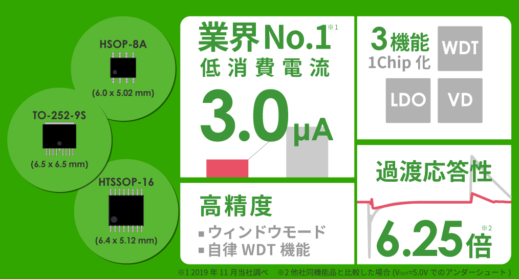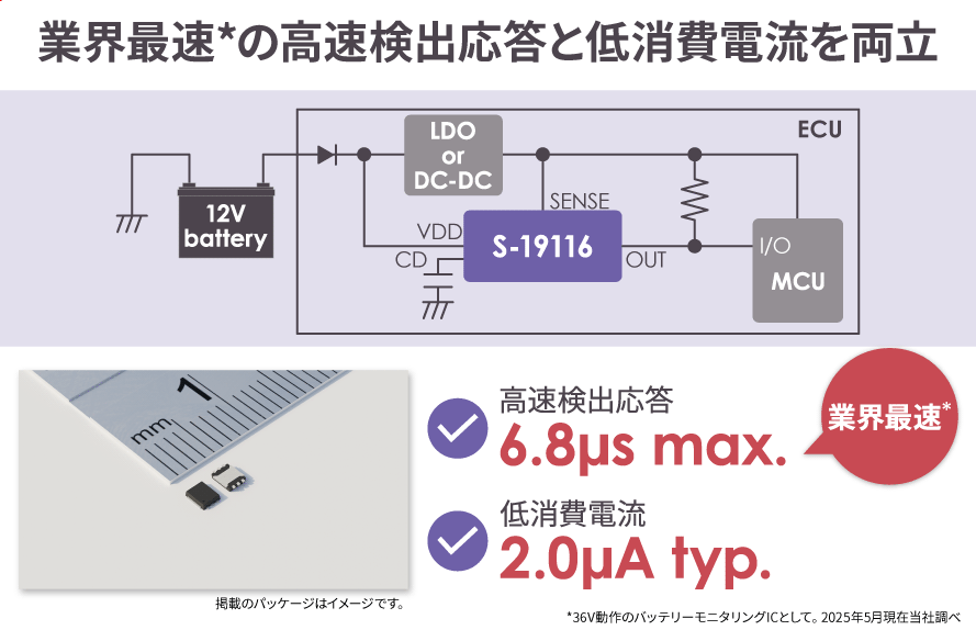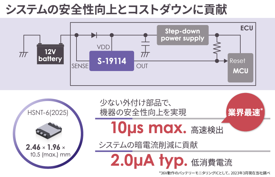業界最速の電圧検出応答時間 6.8µs max.、動作時低消費電流 2.0µA typ.を実現。車載機器の安全性向上と低消費電流化に貢献します。