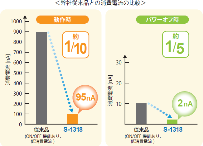 動作時電流 95nA typ.と世界最小クラスの極低消費電流を実現。バッテリ機器の長寿命化に貢献します。