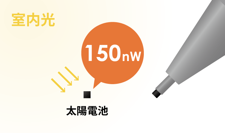 シャープペンシルの芯の断面と同じ面積の太陽電池が、室内光で発電できる電力が約150nWです。