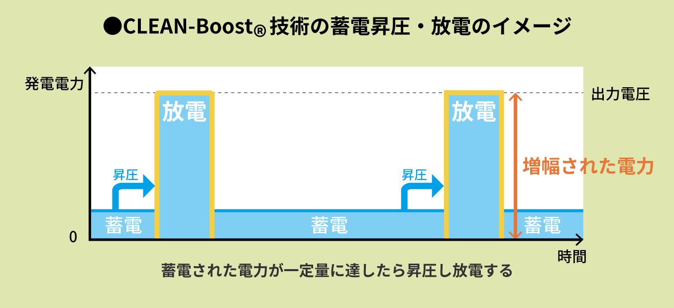 鹿威しが少量の水を溜め、一定の量に達したら水を放出するように、CLEAN-Boost®技術は微小な電力を溜め、電力が所定の量に達したら放電します。
