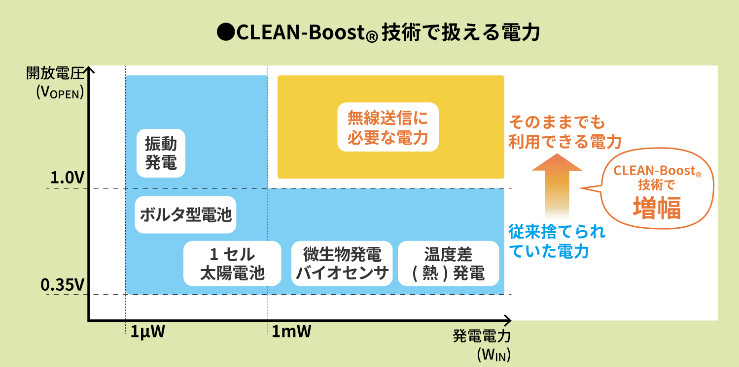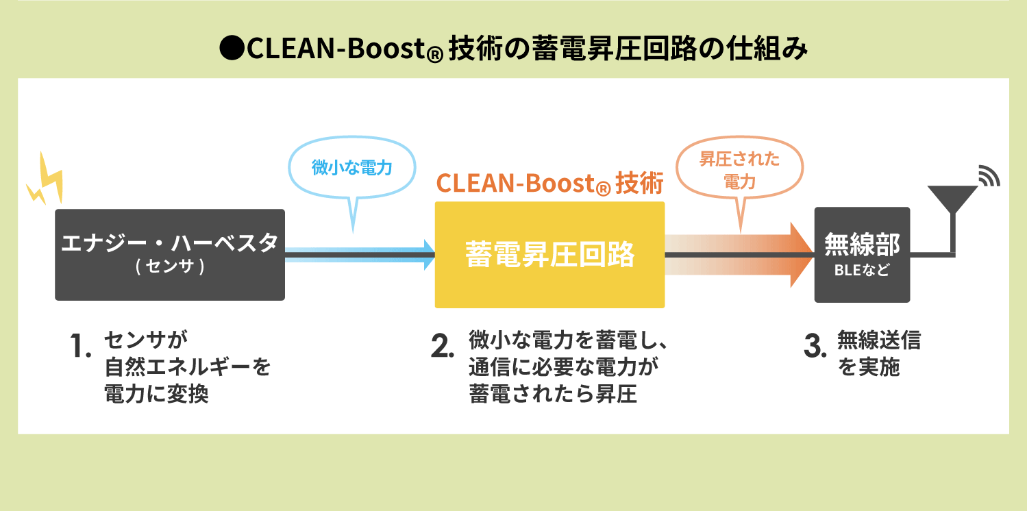 CLEAN-Boost®(※1)技術は、電池レスでIoTデバイスの電源を作り出すことができる、エナジーハーベストに最適な技術です。 CLEAN-Boost®技術を使えば、これまで捨てられていた微小な自然エネルギーを利用し、IoTデバイスを動作させることができます。